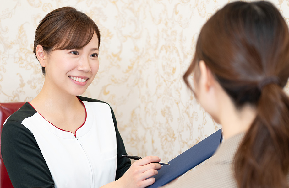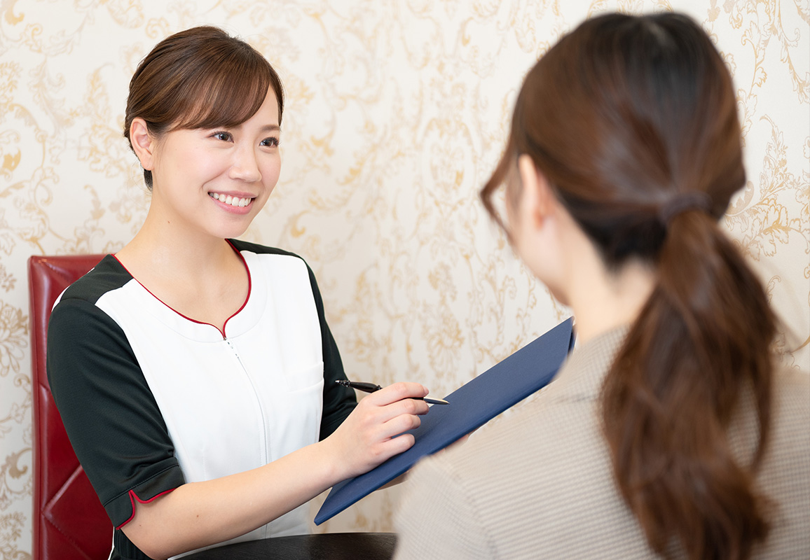 A, お客様のご要望にあわせ、体脂肪やサイズ、お肌の状態など必要事項をチェックします。現在の体調、生活習慣をふまえ、プロの目から判断し、どうすればご要望を叶えられるかをご提案致します。お悩みや気になる事は、どんどんカウンセラーにご相談下さい。