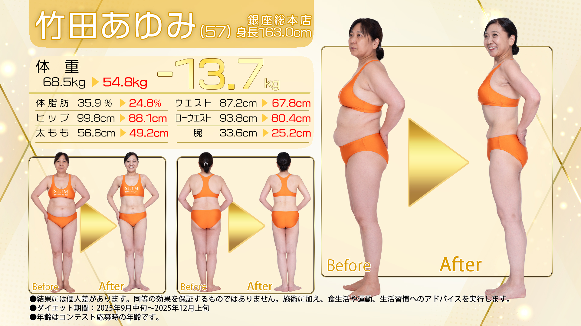 これからの人生を諦めた体型で過ごしたくないと思い最後のチャンスだと思い挑戦して本当に良かったです。