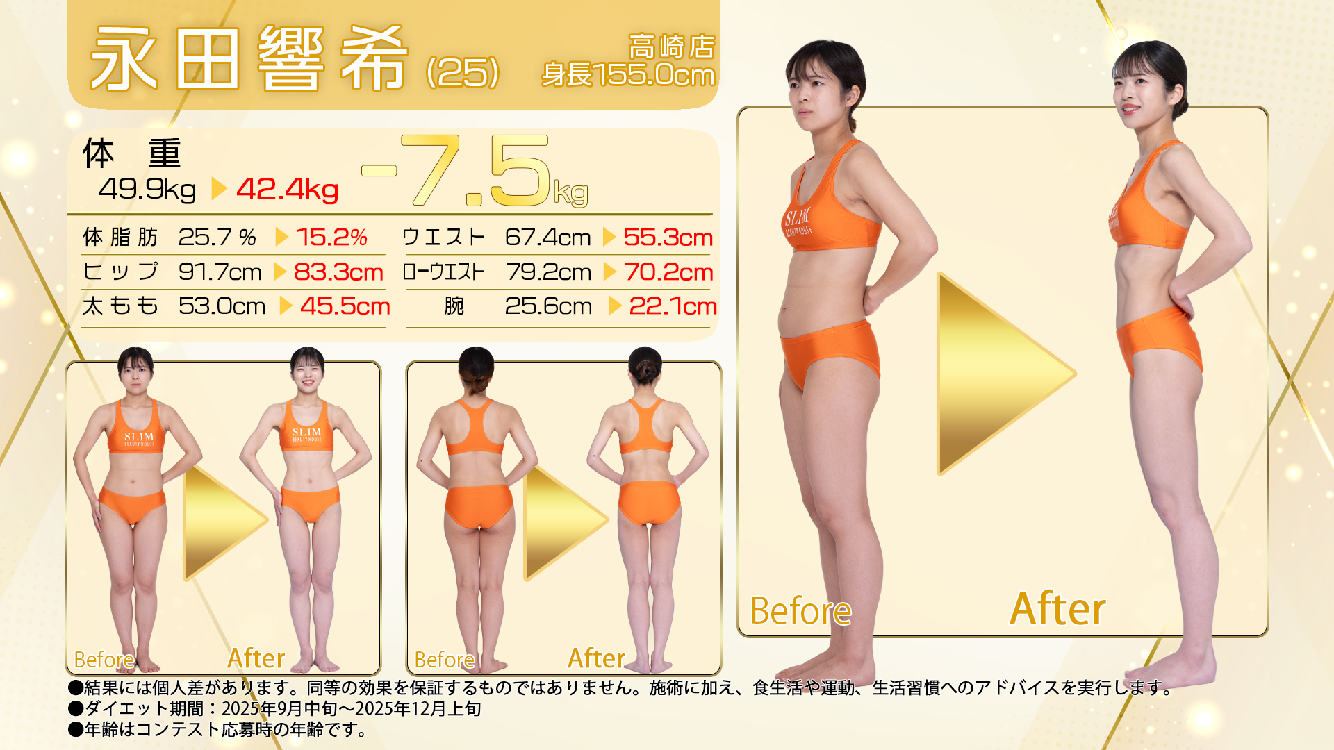 地元から離れたことや転職によるストレスでインドアな生活で、気付けば過去最高の体重を更新しそうでした。 結婚式を挙げるかウェディングフォトを撮りたく、その為に絶対ダイエットをしないといけないと思った時に偶然コンテストのことを知り応募しました。 ダイエット中は担当スタッフさん以外の方も全員で親身に寄り添っていただき、停滞期でモチベーションが下がっているときなどは特に救われました。 今まで自分自身の力ではできなかった太ももの隙間を見たときの感動が1番印象に残っています。
