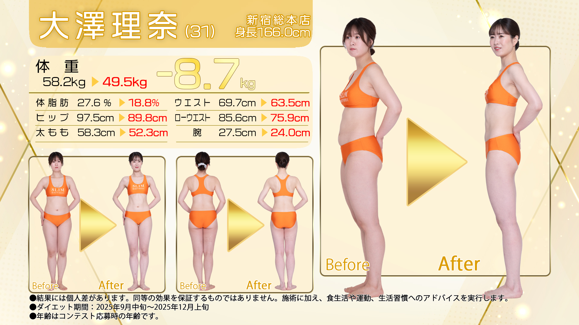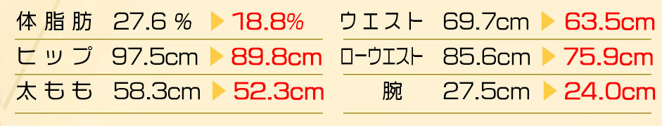 過去最高体重になってしまい、二の腕の太さや顔の丸さを見て、このままじゃいけないと思いコンテストに参加しました。 担当スタッフさんには「一緒に頑張りましょう!」と毎回背中を押してくれたことが本当に励みになりました。 以前より外出がもっと楽しめるようになり、ミニスカートも自信を持って履けるようになれて嬉しいです。